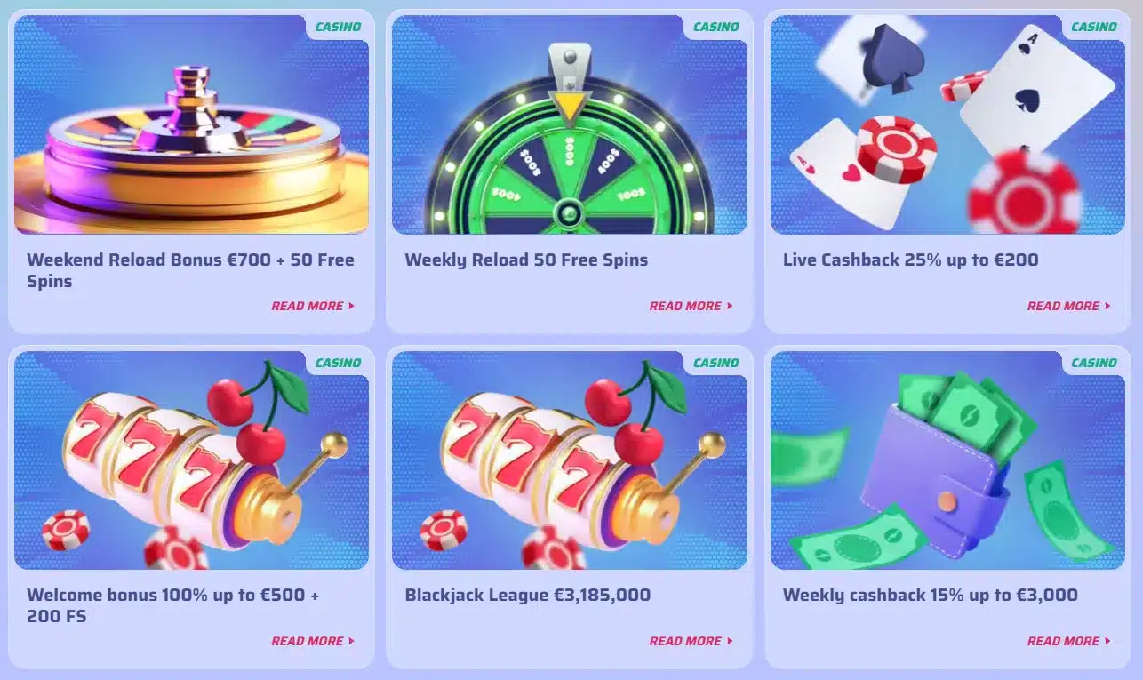 New members at Spinrollz Casino get a 100% bonus up to β¬500 plus 200 free spins. Sports fans can enjoy a 100% bonus up to β¬100 on their first sports bet. Also, there are weekly bonuses, cashback, and special sports betting bonuses for everyone’s taste.