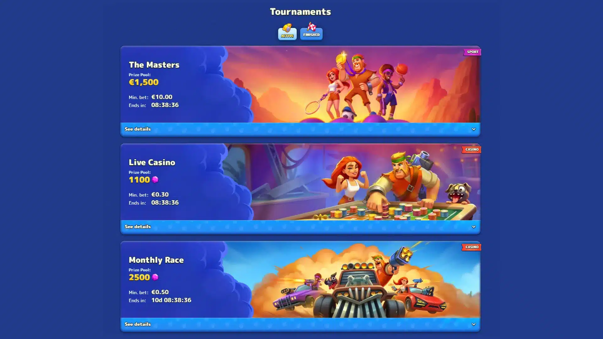 ✔️ The Masters – High-stakes sports-themed tournament with a €1,500 prize pool (min. bet €10)